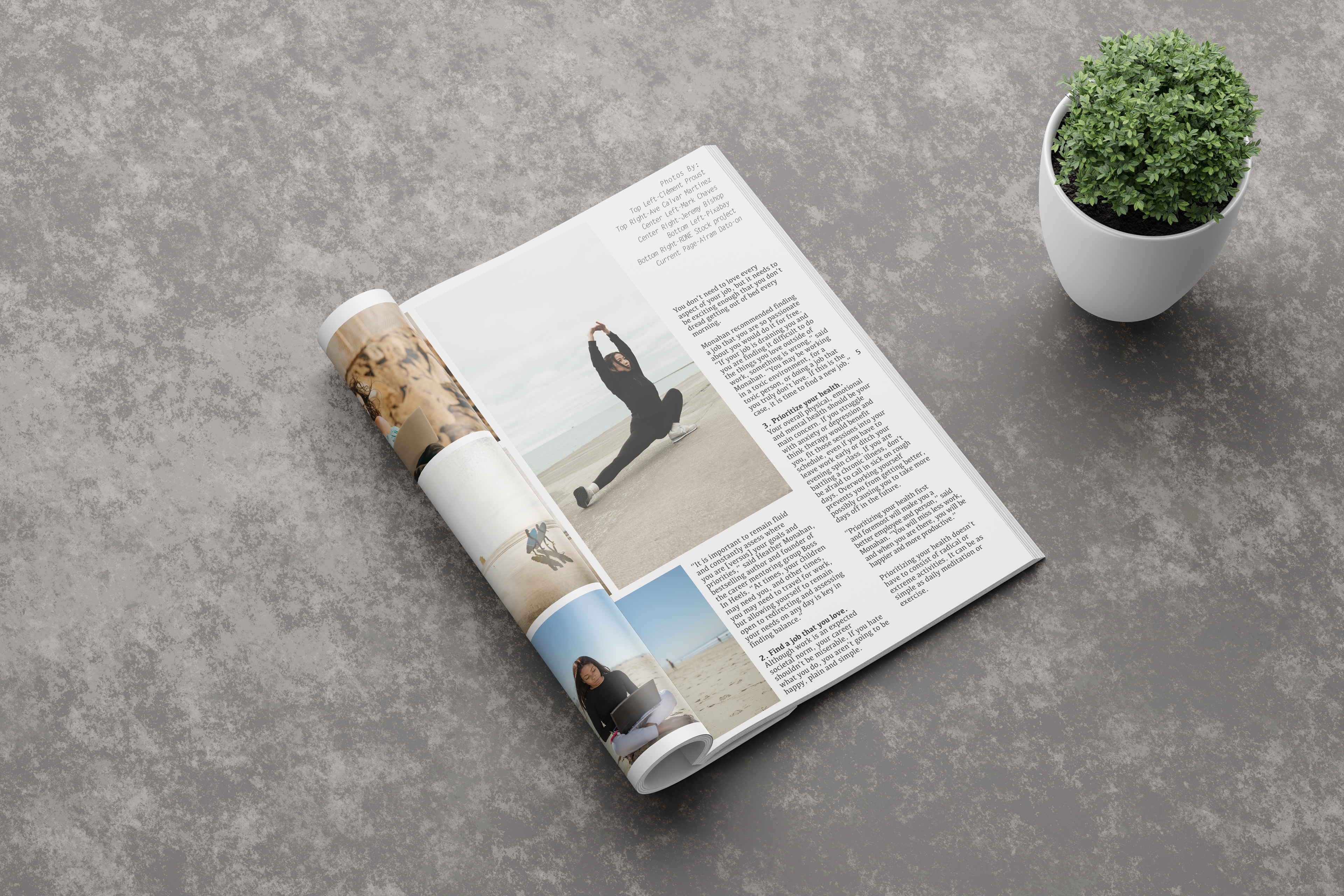 Initial sketches explored how to maintain a strong visual hierarchy while balancing negative space, images, and minimal text. Drafts included explorations of asymmetrical layouts, full-bleed photos, and floating type to best match each magazine’s rhythm and voice. I typically strive for 2-3 concepts before moving forward with one.