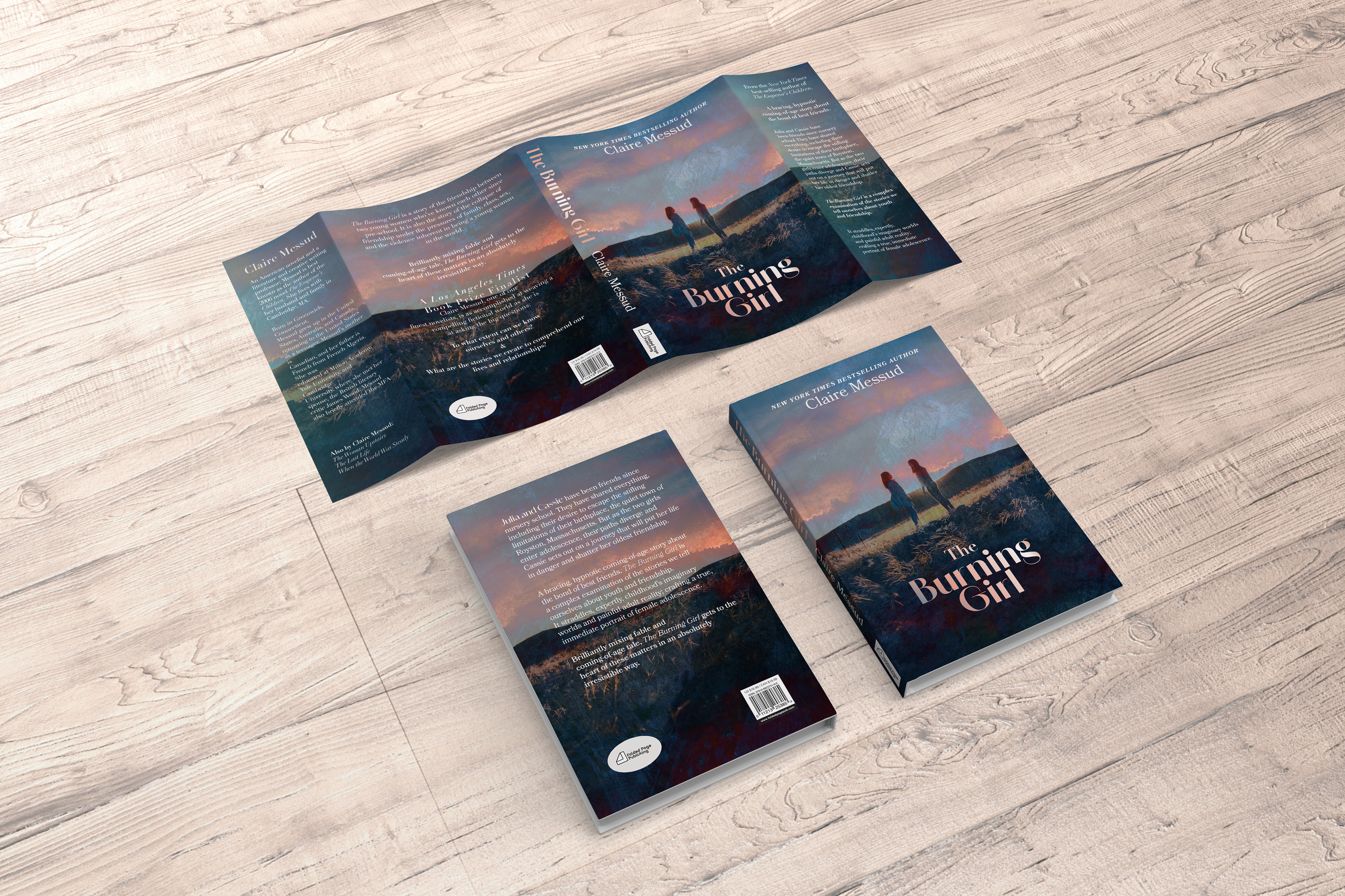 Each book cover communicates the emotional tone and storyline of its respective novel while working together as a visual set. The Burning Girl uses soft sunset hues layered over an image of two girls in an expansive field, with the title floating in a quiet, unobtrusive type. In contrast, The Woman Upstairs features an apartment setting, washed in green gradients and painted overlay, with bold, retro-inspired type suggesting the artistic voice of the narrator. Both designs are unified through consistent layouts, painterly textures, and light touches that offer a dreamy, literary quality.